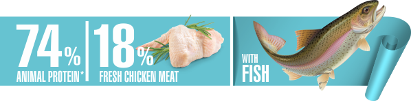 Poultry meal, maize, fresh chicken meat (18%), pea meal, pea protein, fish meal (6,5%), hydrolyzed liver, beet pulp, brewer’s yeast, pea fiber, fish oil (0,5%), mannan oligosaccharides, taurine (0,1%), carnitine (100 mg/kg), glucosamine (600 mg/kg), chondroitin (500 mg/kg), inulin, chicory fiber, methionine, antioxidant.