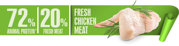 Poultry meal, maize, fresh chicken meat (20%), pea meal, pea protein, dry chicken meat (4%*), hydrolyzed liver, beet pulp, poultry oil, brewer’s yeast, pea fiber, fish oil (0,5%), mannan oligosaccharides, taurine (0,1%), carnitine (100 mg/kg), glucosamine (600 mg/kg), chondroitin (500 mg/kg), inulin, chicory fiber, methionine, antioxidant.