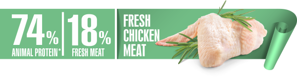 Poultry meal, maize, fresh chicken meat (18%), pea meal, pea protein, dry chicken meat (6,5%), hydrolyzed liver, beet pulp, brewer’s yeast, pea fiber, fish oil (0,5%), mannan oligosaccharides, taurine (0,1%), carnitine (100 mg/kg), glucosamine (600 mg/kg), chondroitin (500 mg/kg), inulin, chicory fiber, methionine, antioxidant.